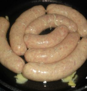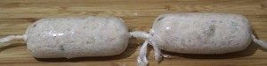 Как бы все, пора остановиться. Но нет. Меня понесло дальше. И родились колбаски рыбные. Сами, между прочим, попросились. Дались они мне легко, не то что предыдущие. Технология уже отработана. А фарш… Зачем далеко ходить? Эти же рыбные котлетки, только в упаковке из кишки. Ну и с добавлением специй (тех же, что и в свиных колбасках).