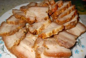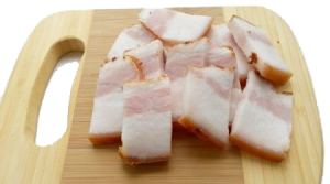 Покупаем сало-мясо, то есть сало с прорезью. Режем на кусочки (больше, меньше, кому как нравится) и варим в соленой воде (где-то час-полтора). А пока готовим намазку. Обычную, стандартную: соль + чеснок + черный перец.